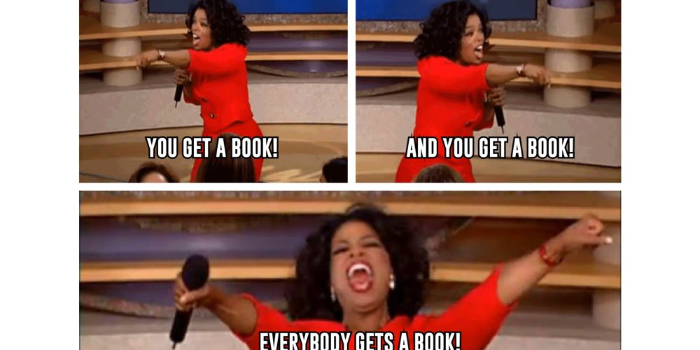 Daarom, geef je boek weg. Jij krijgt een boek, en jij krijgt een boek en jij krijgt een boek!